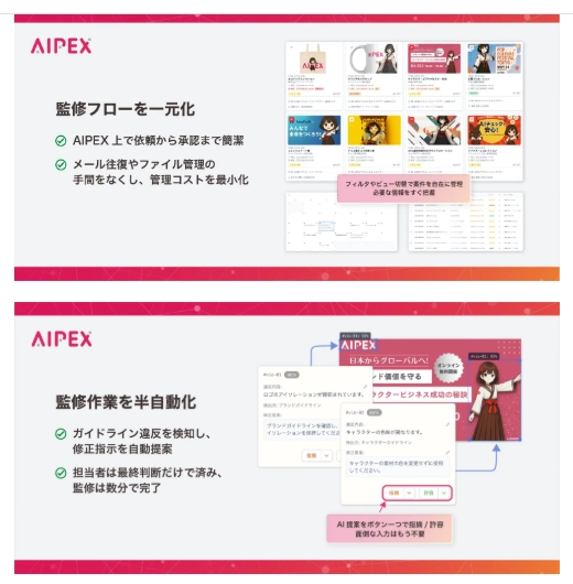 今回、IPホルダー(版権元)とライセンシー(IP使用者)が1つのプラットフォーム上でキャラIP(知的財産)の監修業務を完結させ、AI技術を活用して制作工程の効率化と省略化を実現するサービス「AIPEX」を提供する。複数のIPホルダーとの実証実験においては、監修にかかる作業時間を平均6割削減し、さらにはAIにより抜け漏れのなく確認することに成功した。その結果として、コスト削減とガバナンス強化の面においても高い効果を確認している。