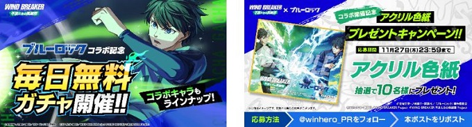 講談社は、 TV アニメ「WIND BREAKER」(ウィンブレ)を題材としたオンラインゲーム「WIND BREAKER 不良たちの英雄譚」(ウィンヒロ)において、11月21日から、TVアニメ「ブルーロック」の期間限定コラボイベント「BLUE BREAKER」を開催している。