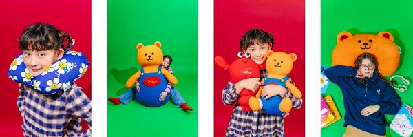 本コラボでは、Yogiboの快適さをそのまま生かしたクッション、ネックピローなどを展開。 wiggle wiggleを象徴する wigglebear・little play bunny・smile we love のモチーフを大胆にあしらっている。