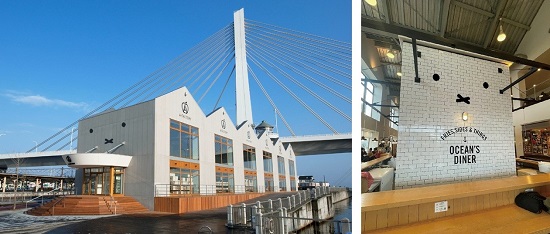 外観と施設内店舗「OCEAN’S DINER」の店頭にミッフィーの顔が登場。同店ではコラボメニューの販売を予定。また、A-FACTORY内ではオリジナルグッズも購入できる。