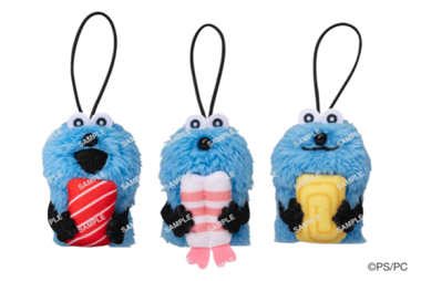 おすしのネタをギュッと抱えるスンスンの、指人形としても遊ぶことができるコラボ限定マスコット。