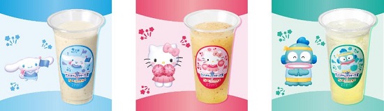パターンB店舗 シナモロールのふわふわバナナミルク/ハローキティのなかよしりんごスムージー/ハンギョドンのにこにこレモンソーダ