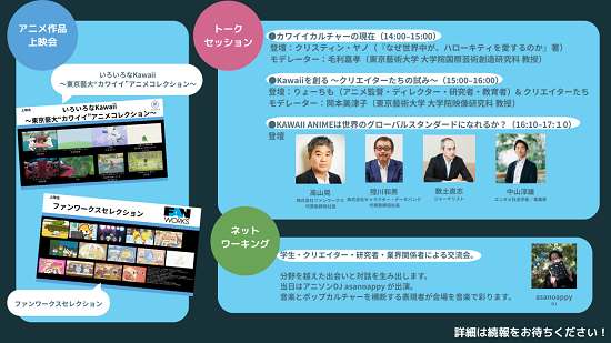本イベントは、東京藝術大学の2研究科と、数多くの“KAWAII ANIME”作品を手がけてきたファンワークスが共同で実施。上映会、トークセッション、ネットワーキングを通じて、クリエイター・学生・業界関係者が集い、“KAWAII ANIME”の魅力と可能性を共有する1日となる。